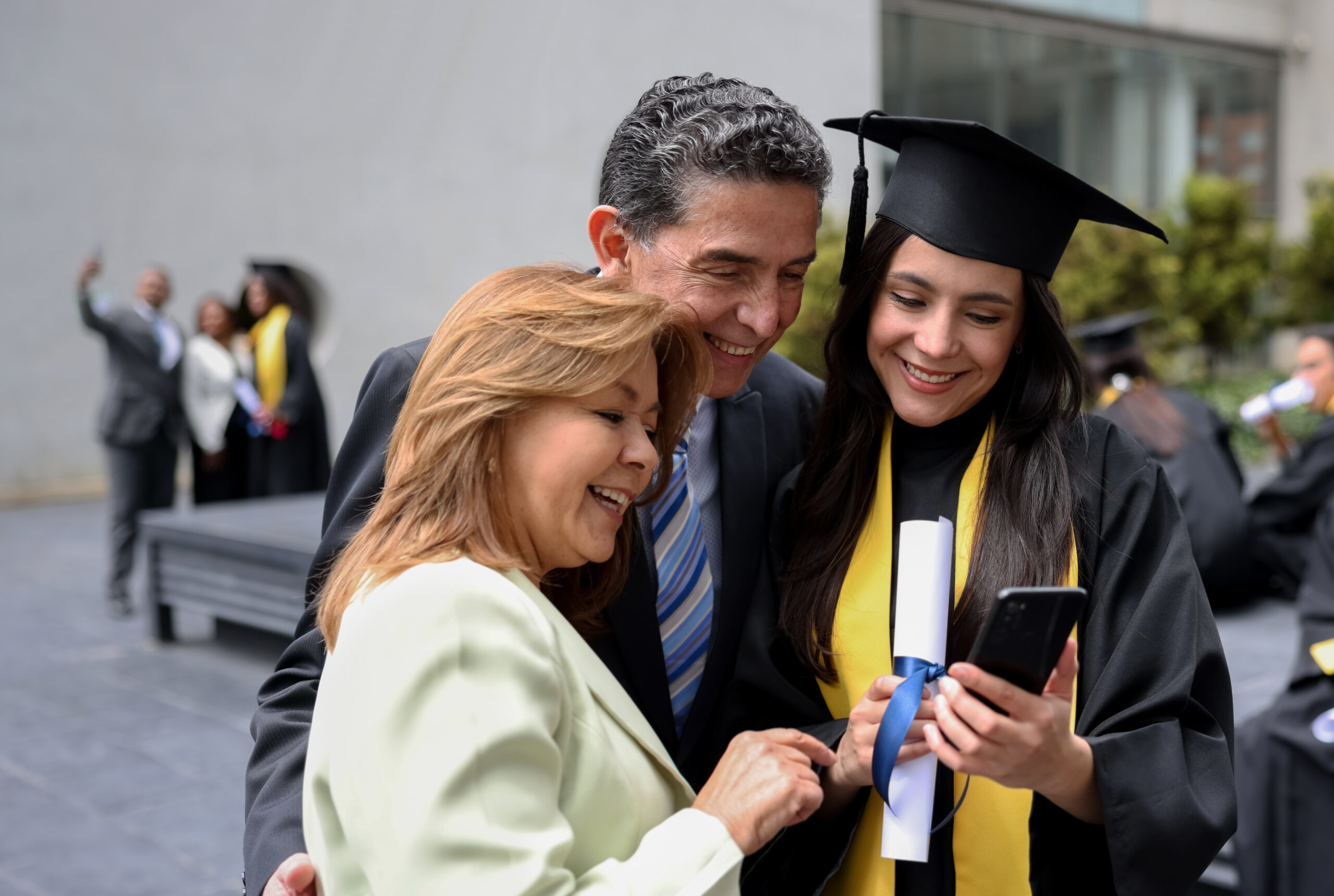 Graduating student looking at a picture on her cell phone with her parents